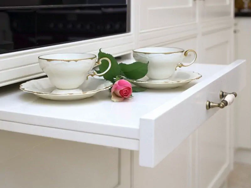 Meble kuchenne Wit Stwosz to oczywiście nie tylko drewno i MDF. Na co dzień przy ich produkcji łączymy je również z innymi materiałami / surowcami, takimi jak kamień (kamienne blaty kuchenne z konglomeratu kwarcowego, kwarcu, granitu, bazaltu, trawertynu, marmuru lub porfiru), szkło (przeszklone fronty szafek), ceramika, metal - w tym aluminium (różne metalowe elementy szafek), stal nierdzewna, żeliwo, kompozyt (technicznie rzecz biorąc kompozyt to mieszanka dwóch lub większej liczby elementów i w tym kontekście nawet płyta MDF jest kompozytem, w praktyce o kompozycie częściej mówimy w kontekście kompozytowych, w tym betonowych blatów kuchennych)
