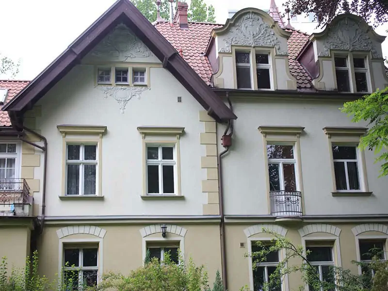- okna drewniane z okiennicami, z roletami zewnętrznymi, z wywietrznikami, z nawiewnikami, z parapetem drewnianym lub kamiennym,